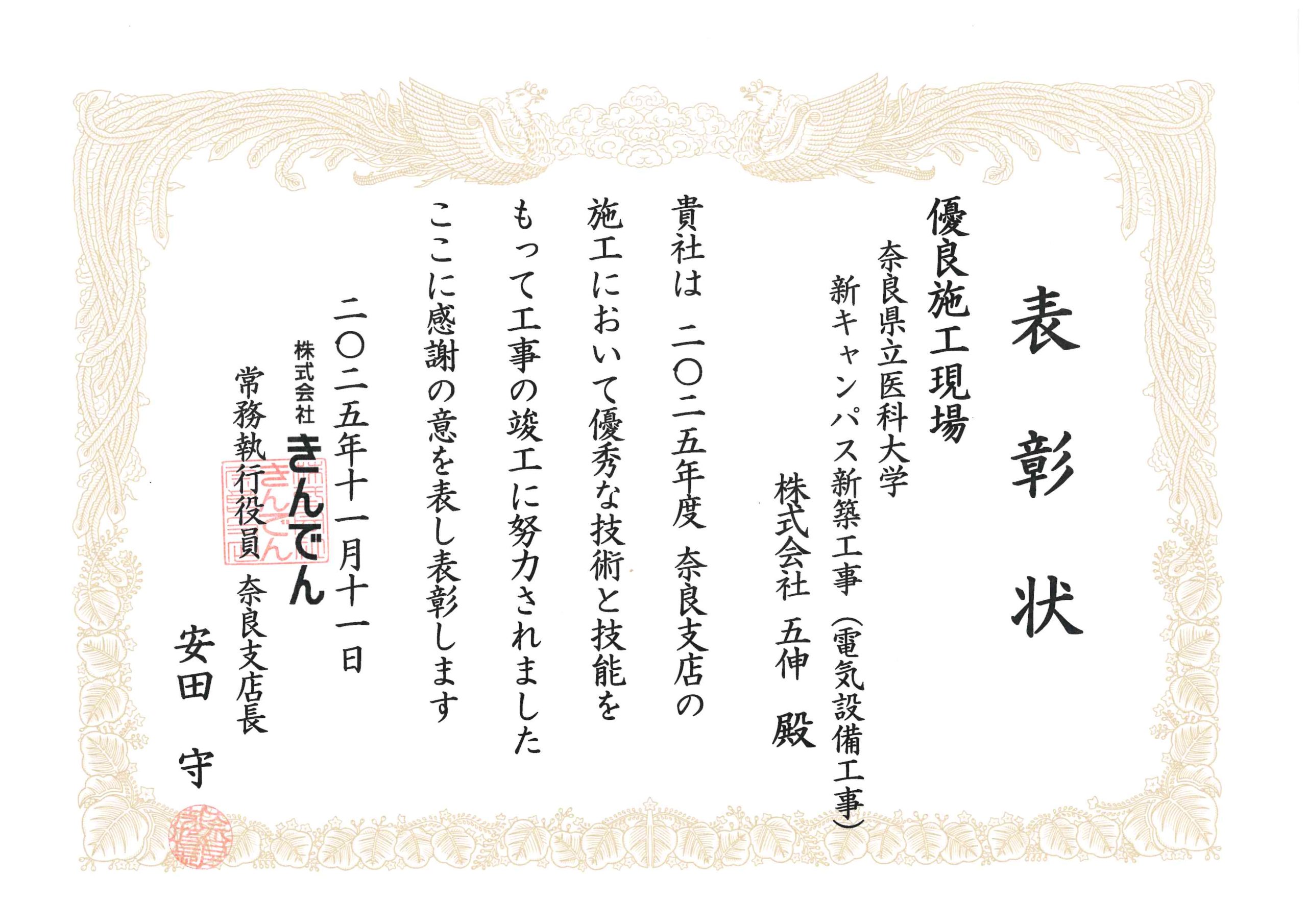 この度、2025年11月11日㈫に開催されました、株式会社きんでん 奈良支店様主催の技術成果発表会におきまして、光栄にも優良現場施工業者として表彰して頂きました😂